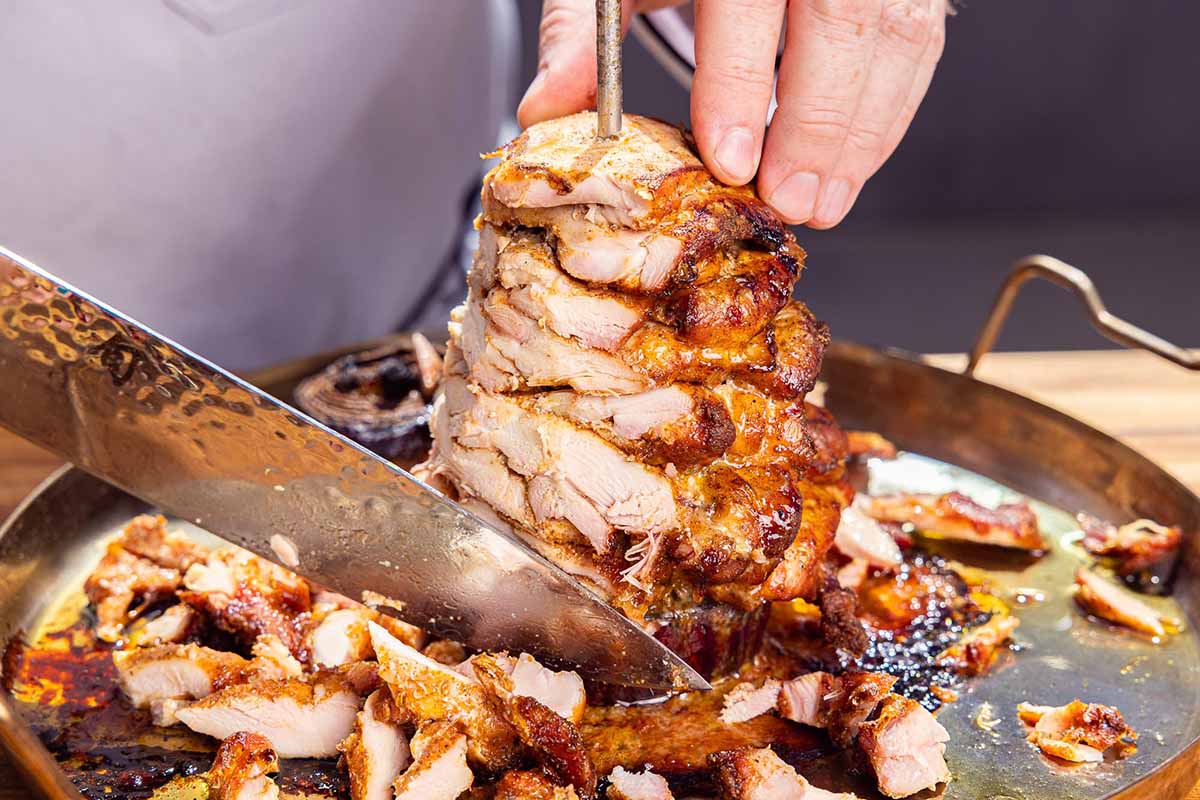 Originating from Eastern street foods, shawarma is typically made by marinating slices of meat, such as skinless chicken thighs or chicken breast, in a blend of eastern spices like black pepper, garlic powder, turmeric, and allspice. The meat is then stacked on a vertical spit and slow-roasted until it reaches the perfect internal temperature.